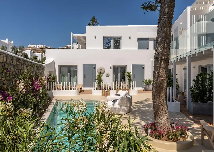 Oniro Suites Mykonos Town hotel met 8 kamers, gelegen op amper 5 minuten lopen van Space Club, biedt een zwembad en Wi-Fi in openbare gebieden. Het 3-sterrenhotel is voorzien van een archeologisch museum, terwijl het Strand van Paranga op 4 km afstand ligt.